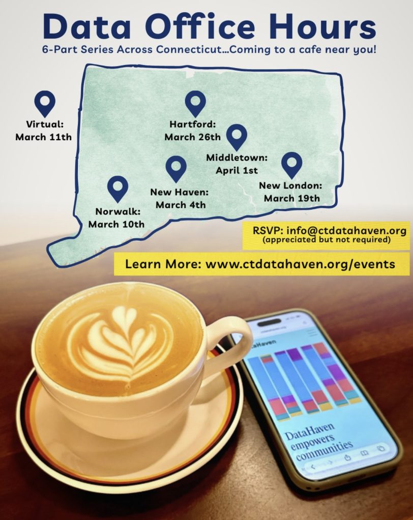 DataHaven is excited to announce Data Office Hours, coming to a cafe near you in Hartford, Middletown, New Haven, New London, and Norwalk, as well as virtually!