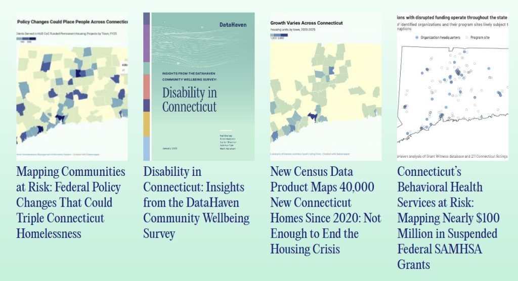 So far this month, DataHaven has published four new reports covering some of the most urgent issues facing Connecticut: housing, homelessness, disability rights, and behavioral health. Plus, scroll down to learn about how you can join DataHaven staff at our Data Office Hours events from March 4 to April 1 in Hartford, Middletown, New Haven, New London, Norwalk, and virtually.
