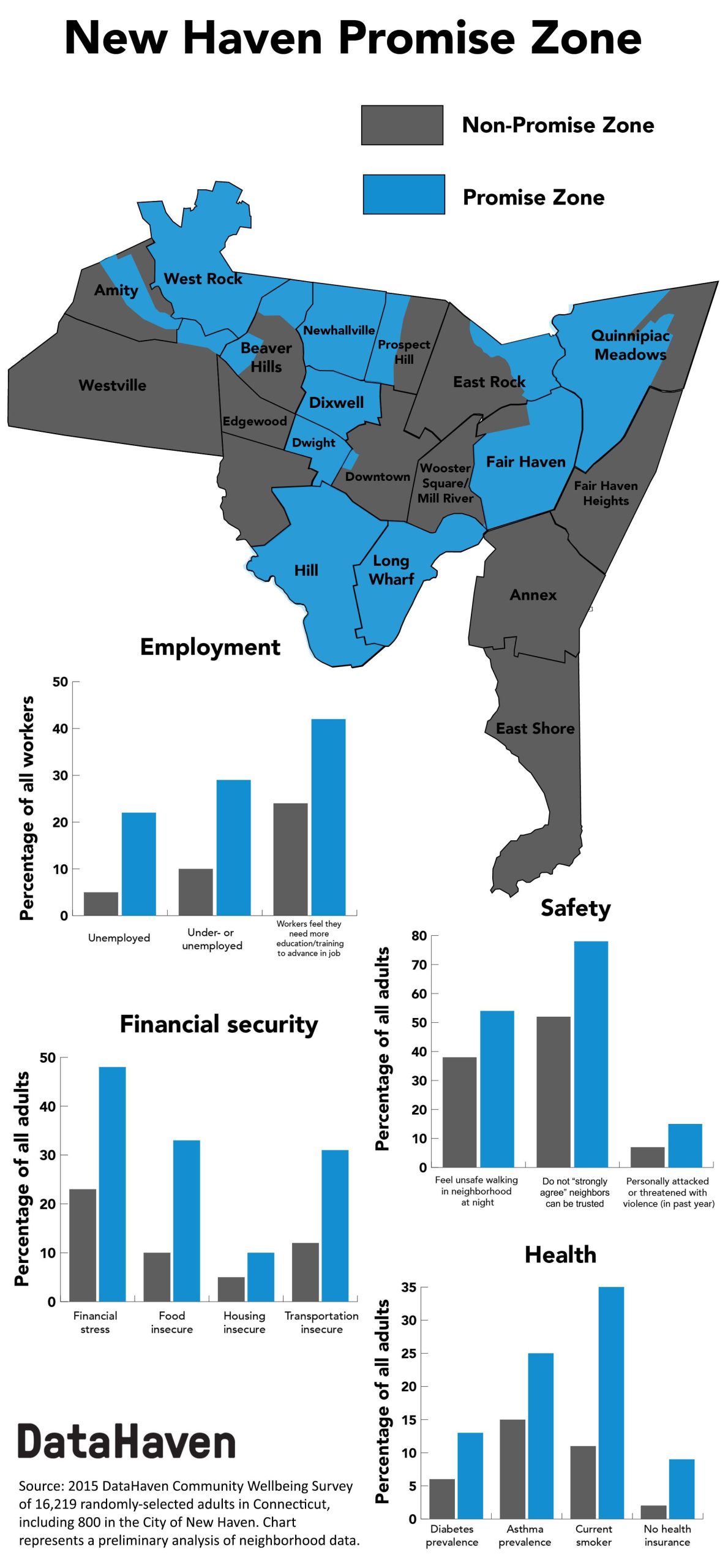 As the city awaits the results of this year’s competition, data from the 2015 DataHaven Community Wellbeing Survey underscores the need for additional resources in the neighborhoods that comprise the proposed “Zone.”