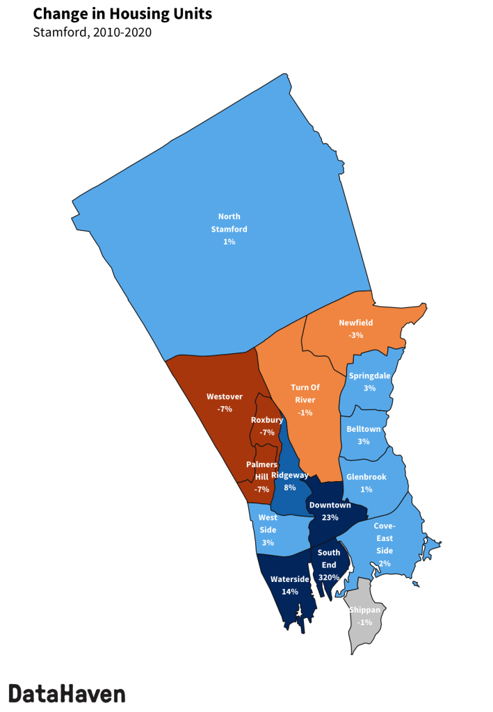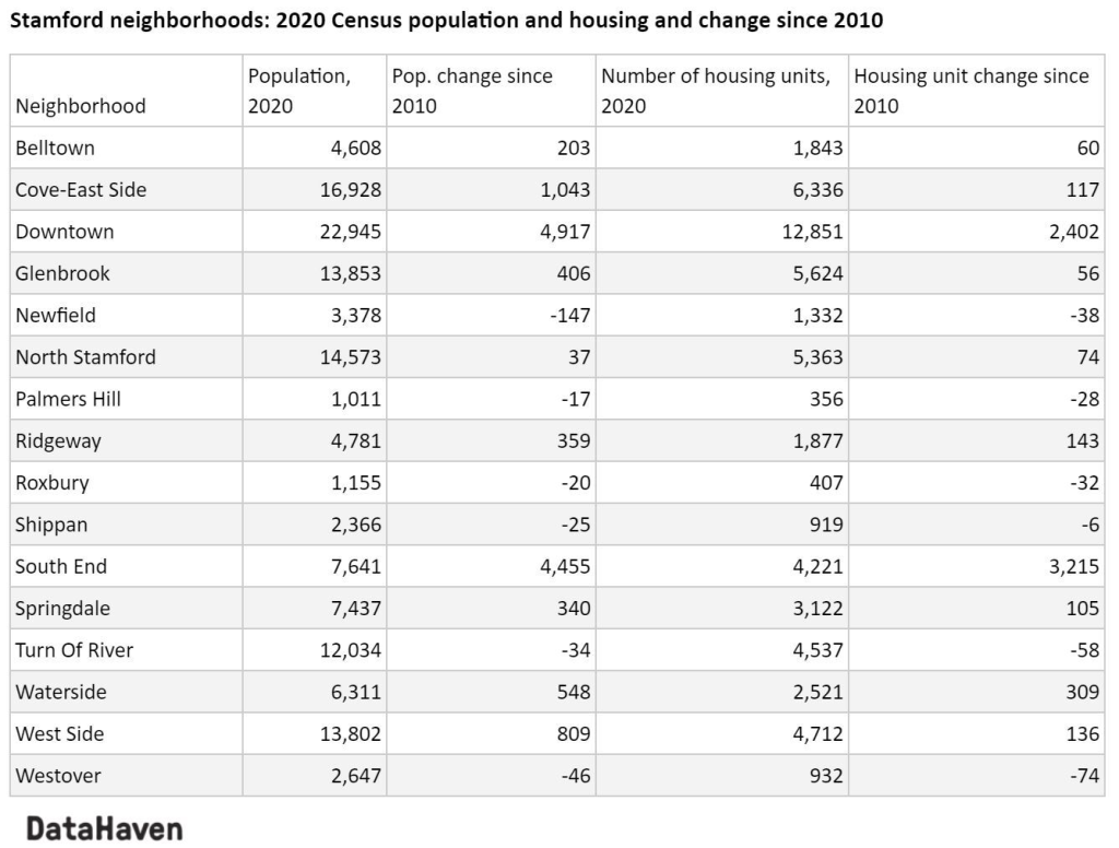 The 10 percent increase in Stamford’s population followed the statewide trend in which the 10 largest cities collectively gained 37,109 residents while the remaining 159 towns collectively lost 5,262 residents. However, the change in population did not evenly affect all of Stamford’s neighborhoods.