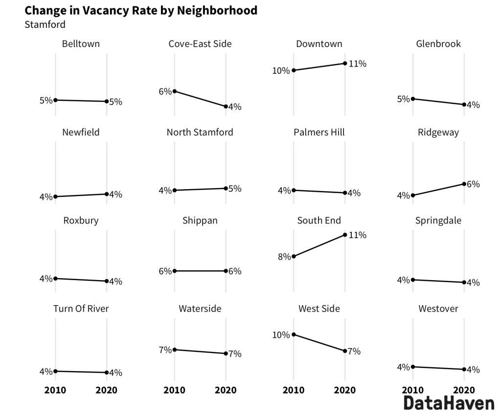 Most neighborhoods in Stamford experienced less than a one percentage point change in the vacancy rate. South End had the largest increase in vacancy rate, increasing from 8 percent to 11 percent due to experiencing a larger increase in housing units than residents. However, local-level housing vacancy rates shift continuously due to a range of factors including renovations and the leasing up of newly-constructed apartment buildings.