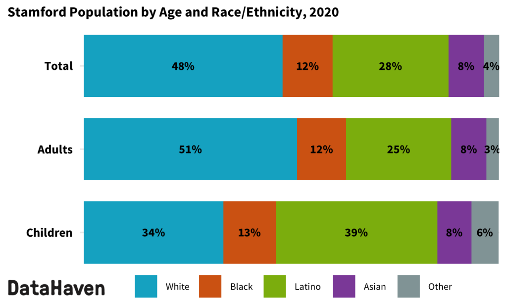 The Black population of Stamford remained relatively unchanged, increasing by 95 residents. The Black population makes up 12 percent of the population of Stamford, down from 13 percent in 2010.