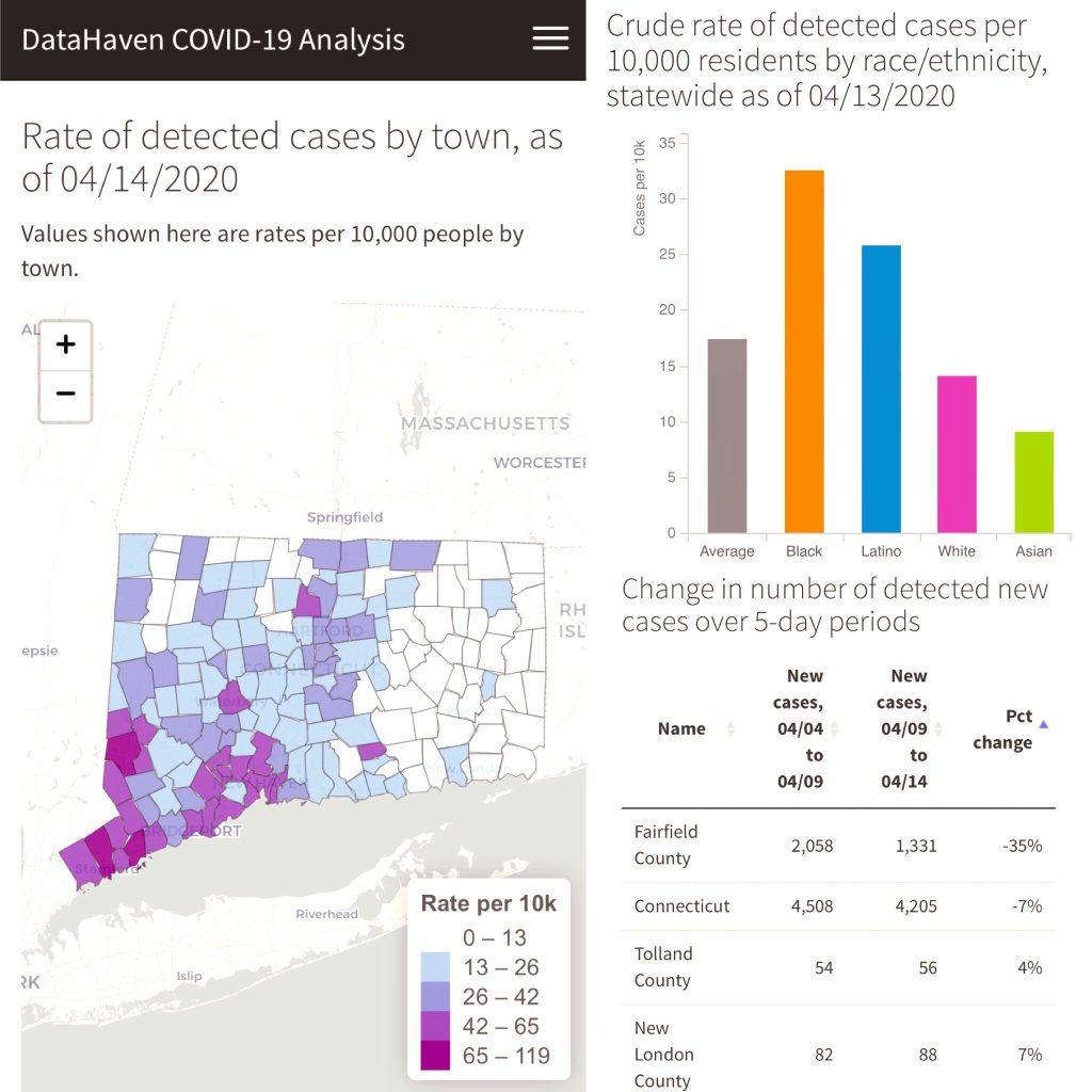 In response to requests from local partners, DataHaven developed a report (see below) with our original analyses and visualizations of public data related to the coronavirus pandemic. Initially published in March 2020, the report was frequently updated as new data were posted through June 2022. Further updates will be done less frequently or on request. We have also created many other charts and datasets available on request.