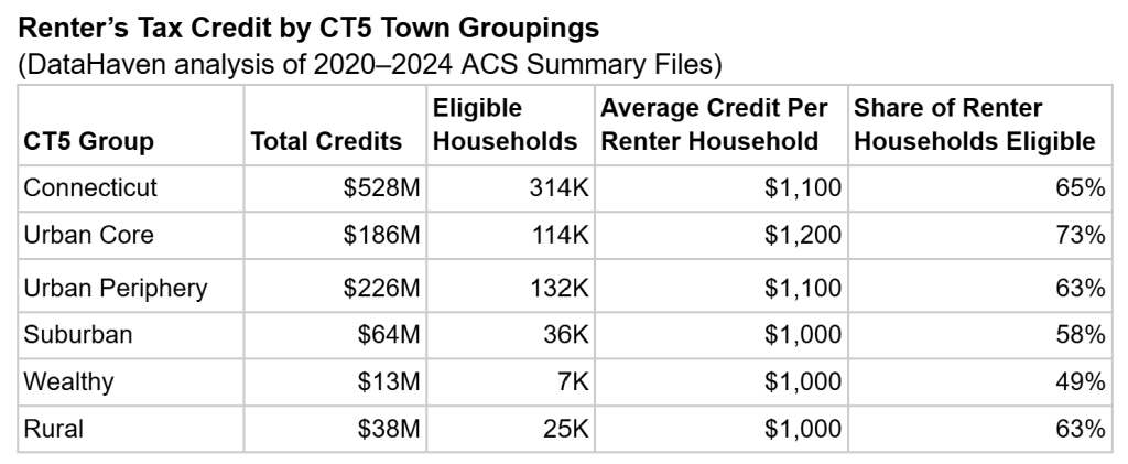 Total credit amounts and counts of households were aggregated to the Five Connecticuts (CT5) level from the town level. For towns, legislative districts, and CT5 regions, average credit amount per renter household and shares of eligible households among renter households were calculated.