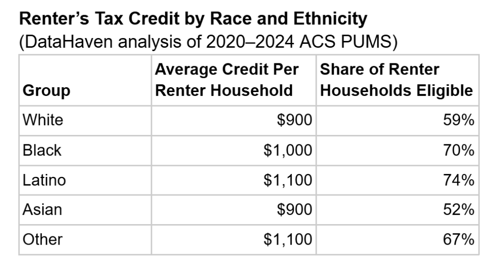DataHaven analyzed U.S. Census Bureau data to understand how a proposed renter’s tax credit would impact communities in Connecticut. We estimated the total credit and number of households that would be eligible, the average credit that renters would receive, the share of renter households that would be eligible, and how these amounts would vary across towns, legislative districts, and racial and ethnic groups.
