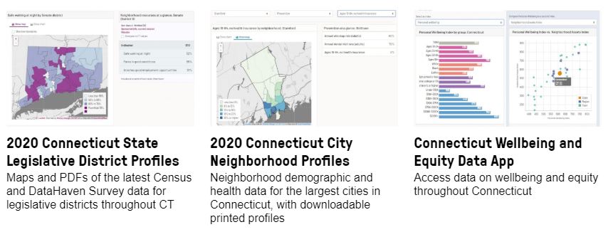 Visit https://www.ctdatahaven.org/data-dashboard for a preview of our newest data tools, including the Connecticut Wellbeing and Equity Data App and updated mapping tools for neighborhoods and Connecticut legislative districts. These tools use the latest data visualization technology (React, Bootstrap, Semiotic, Leaflet), making them highly-responsive on mobile devices when compared to other existing tools.