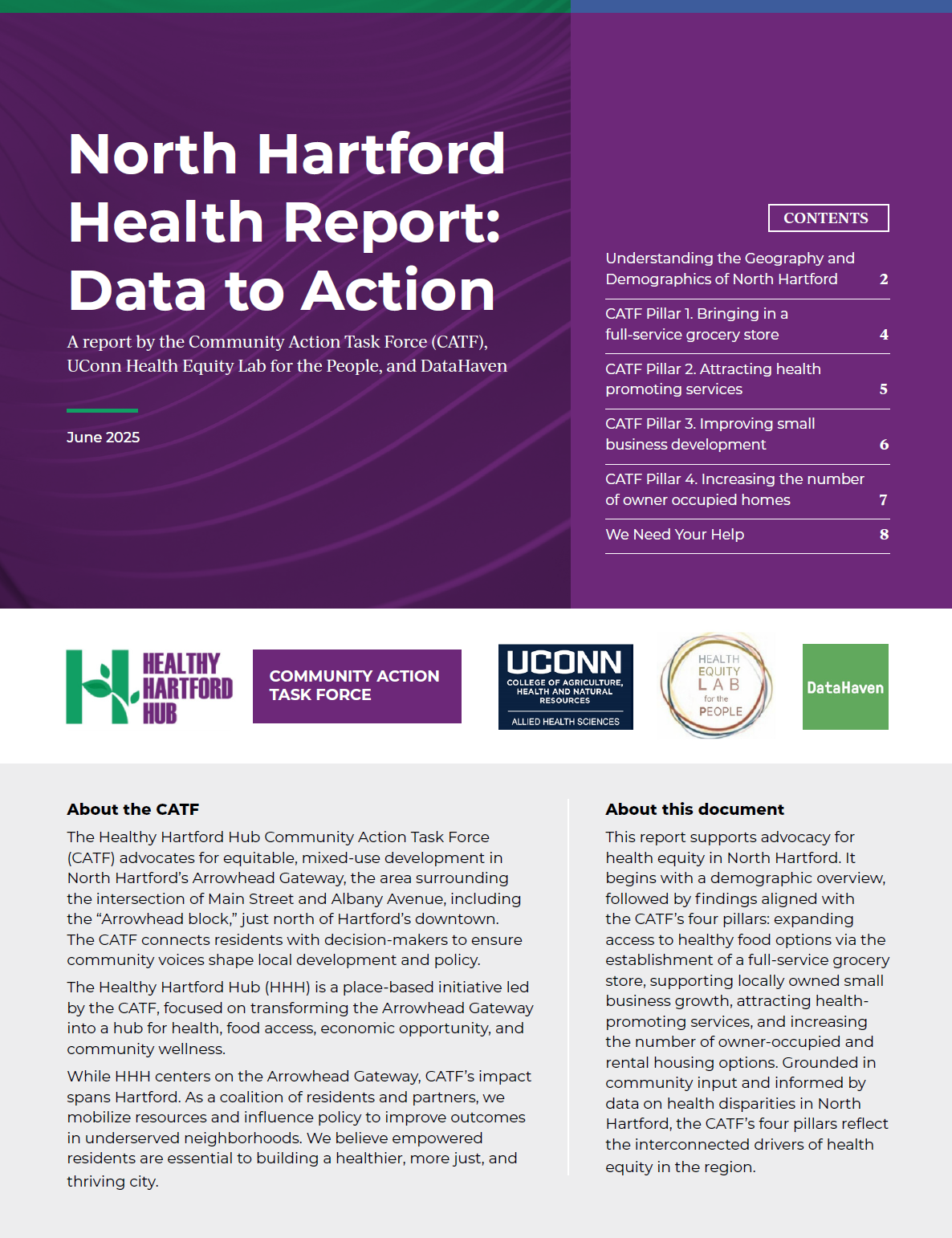 This report supports advocacy for health equity in North Hartford. It begins with a demographic overview, followed by findings aligned with the CATF’s four pillars: expanding access to healthy food options via the establishment of a full-service grocery store, supporting locally owned small business growth, attracting healthpromoting services, and increasing the number of owner-occupied and rental housing options. Grounded in community input and informed by data on health disparities in North Hartford, the CATF’s four pillars reflect the interconnected drivers of health equity in the region.